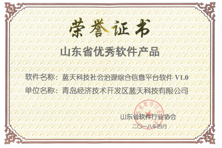 2018.4 社会治理产品荣获山东省优秀软件产品
