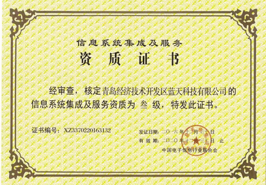 2016.12 公司荣获信息系统集成及服务资质证书叁级