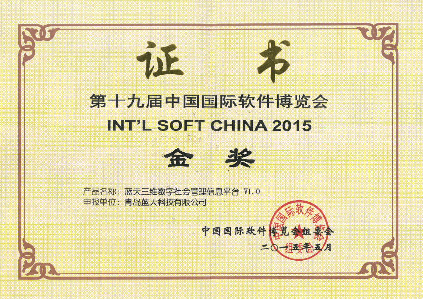 2015.5 公司社会治理信息系统平台、OA协同办公软件获得第十九届中国国际软件博览会金奖,民声说吧系统获得第十九届中国国际软件博览会技术创新奖