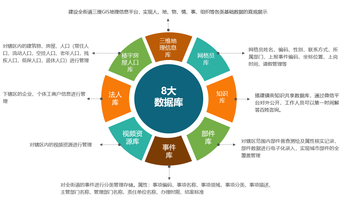 涵盖楼宇房屋人口库、法人库、视频库、事件库、部件库、知识库、网格员库、GIS地理库;集人、地、物、情、事、组织为一体大数据中心。